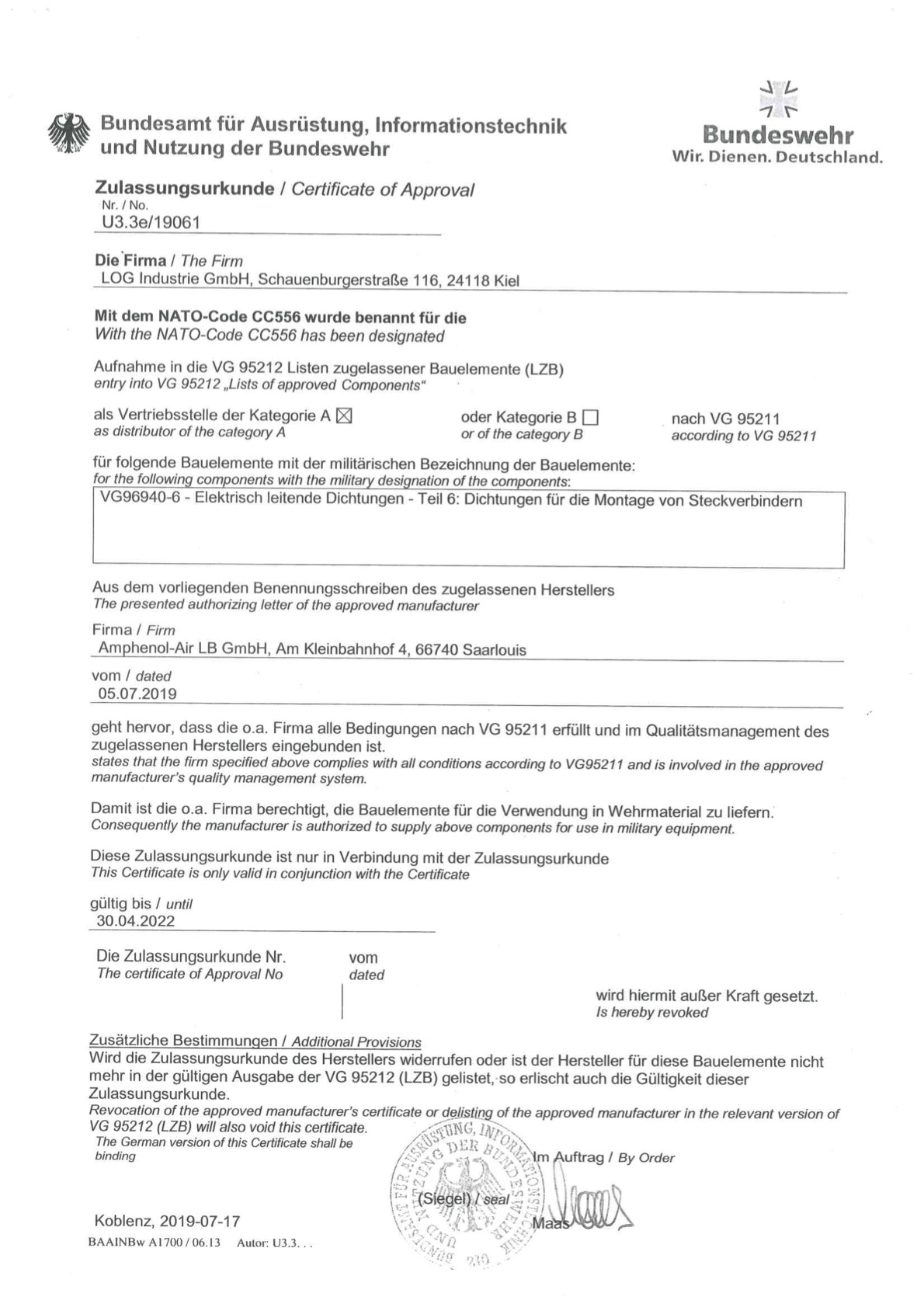 Für Ihr Unternehmen bedeutet das die Sicherheit, dass LOG Industrie den hohen Qualitätsanforderungen der Bundeswehr entspricht, wenn Sie von uns Bauteile, Kits oder individuelle Lösungen der Verbindungstechnik beziehen. Sie entsprechen den Normen VG95234, VG95328, VG95212, VG96912, VG95319-1011 und VA96940-6.